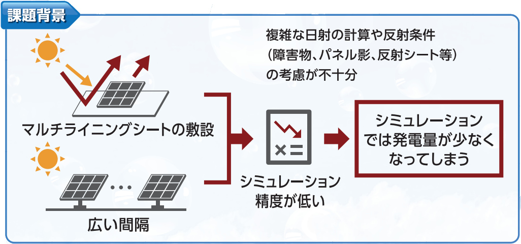 従来手法は、複雑な日射・反射条件(障害物、パネル影、反射シート等)の考慮が不十分であり発電量算出の精度向上が必要でした。