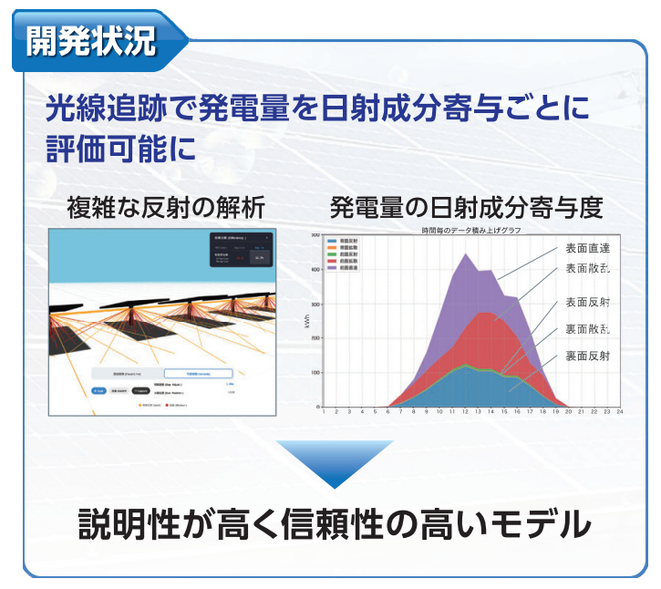 光線を追跡する手法によって複雑な日射・反射条件を扱い、発電量を日射成分ごとに評価可能にしました。