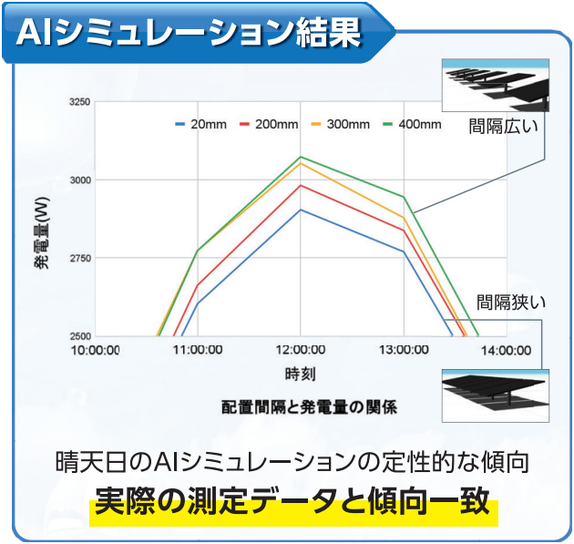 モジュール間の離隔差異と発電量を東京大学共同研究での実証値とAIシュミレーション値で比較検証しました。