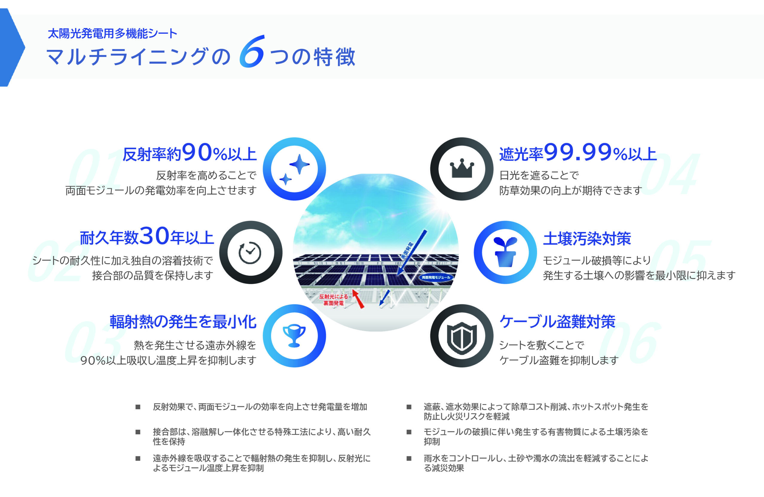 マルチライニングとは最新の太陽光両面発電モジュールの発電量の増加と、抜群の防草効果を発揮し、作業効率の向上やコスト削減を実施し単位面積あたりの発電量の最大化を実現します。