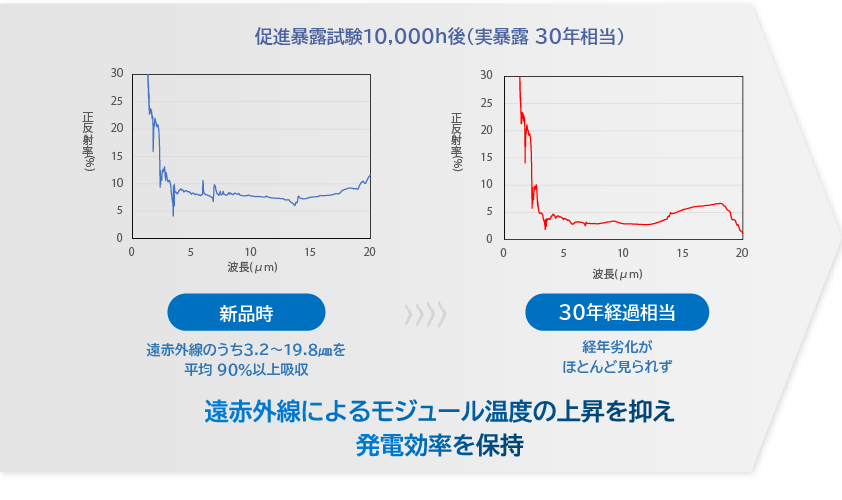◎遠赤外線を吸収することで輻射熱の発生を抑制し、反射光によるモジュール温度上昇を抑制