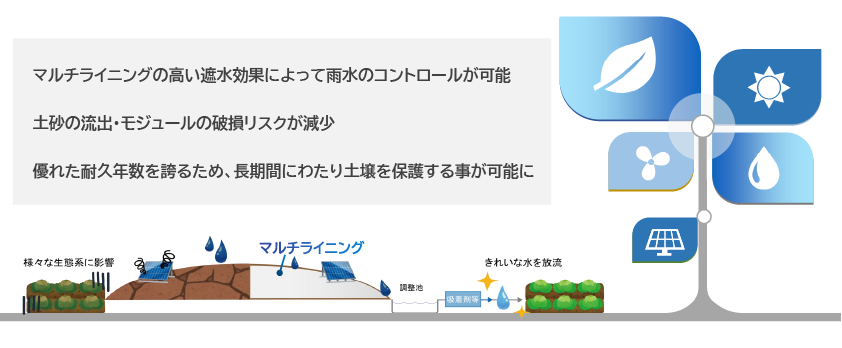 マルチライニング・マルチファイバー(防草マット)を工場で一体加工し出荷することによりシートの飛散を抑制します。製品を一体化させる事で裏面発電材としての反射機能と、20年以上の防草効果、優れた耐久性を合わせ持つことが可能となり、高い遮水機能で雨水をコントロールし土砂の流出や濁水流出を軽減する減災効果が期待できます。