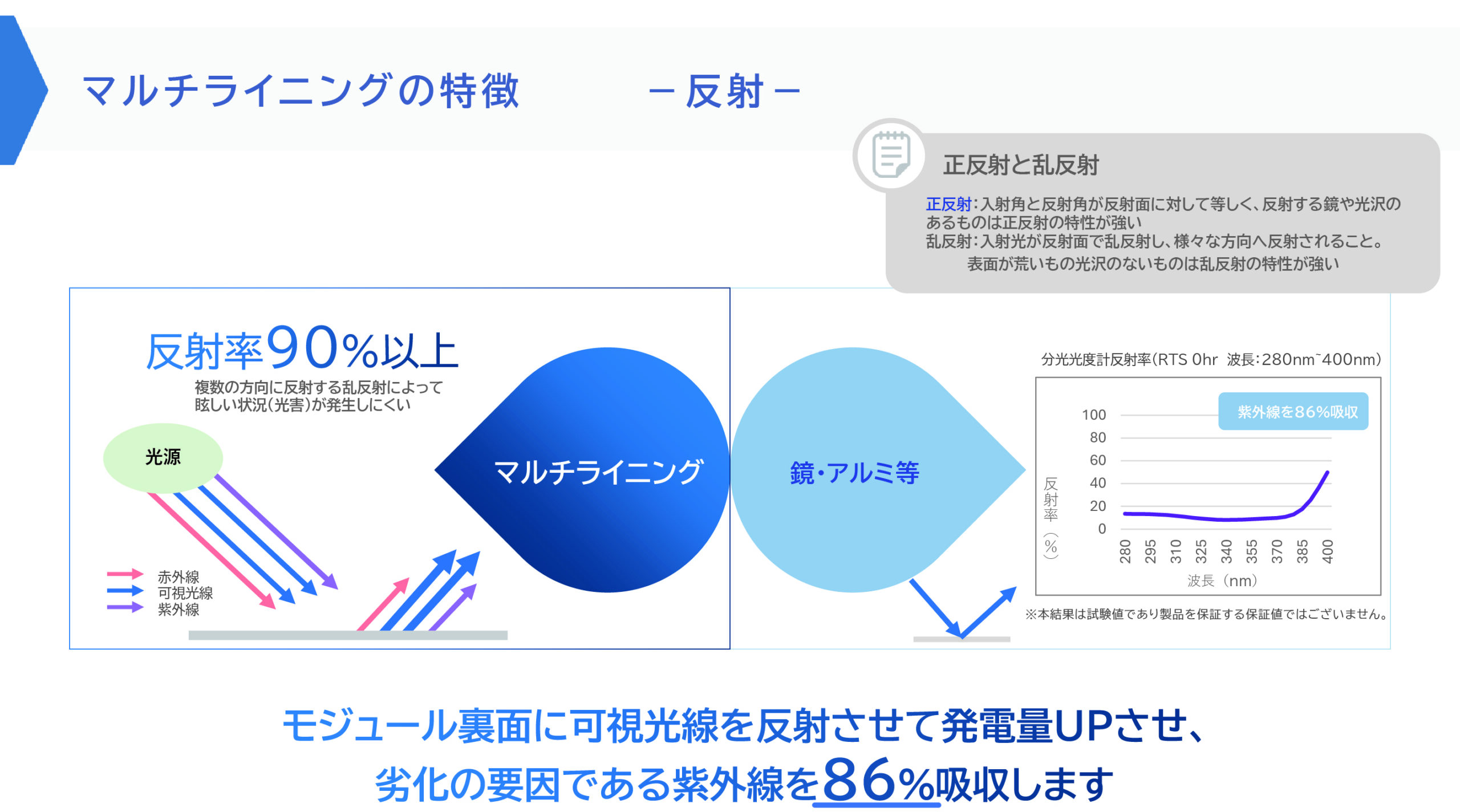 →モジュール裏面に可視光線を反射させて発電量UPさせ、劣化の要因である紫外線は吸収します。