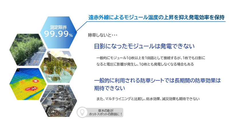 ◎遮蔽、遮水効果によって除草コスト削減、ホットスポット発生を防止し火災リスクを軽減